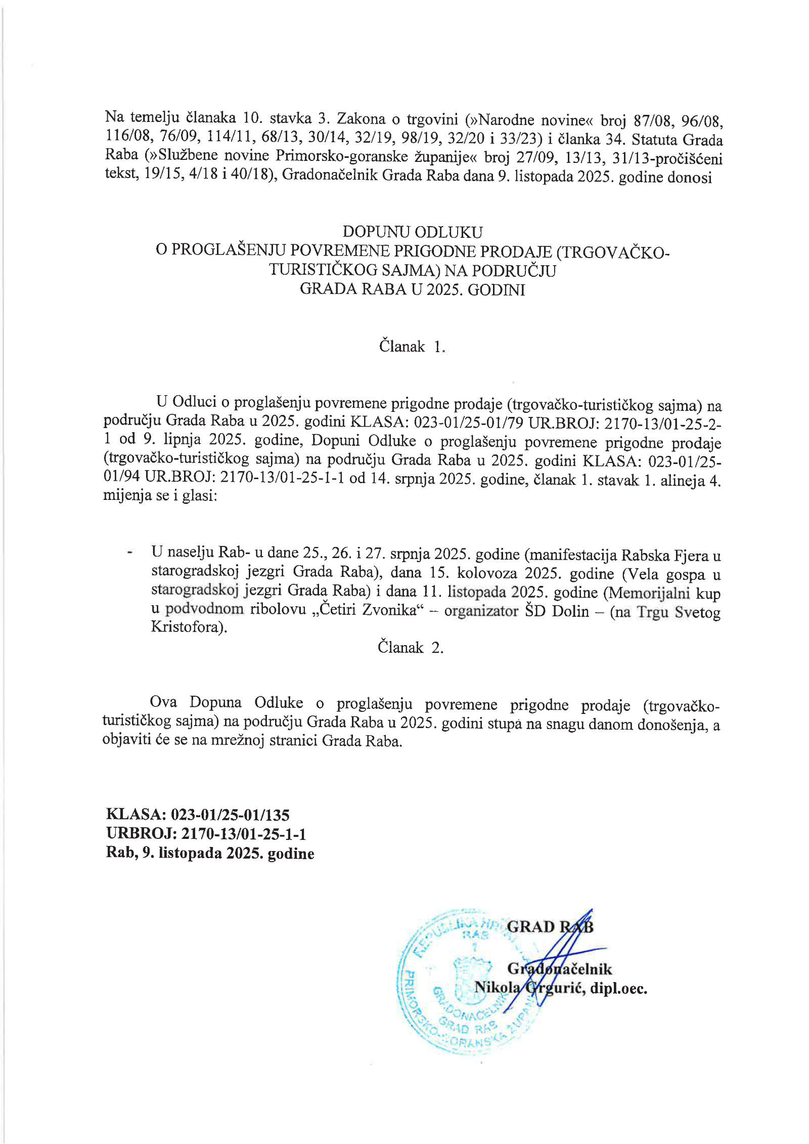 Dopuna Odluke by admin | Oct 9, 2025 | Uncategorized DOPUNA ODLUKE O PROGLAŠENJU POVREMENE PRIGODNE PRODAJE (TRGOVAČKO-TURISTIČKOG SAJMA) NA PODRUČJU GRADA RABA U 2025. GODINI