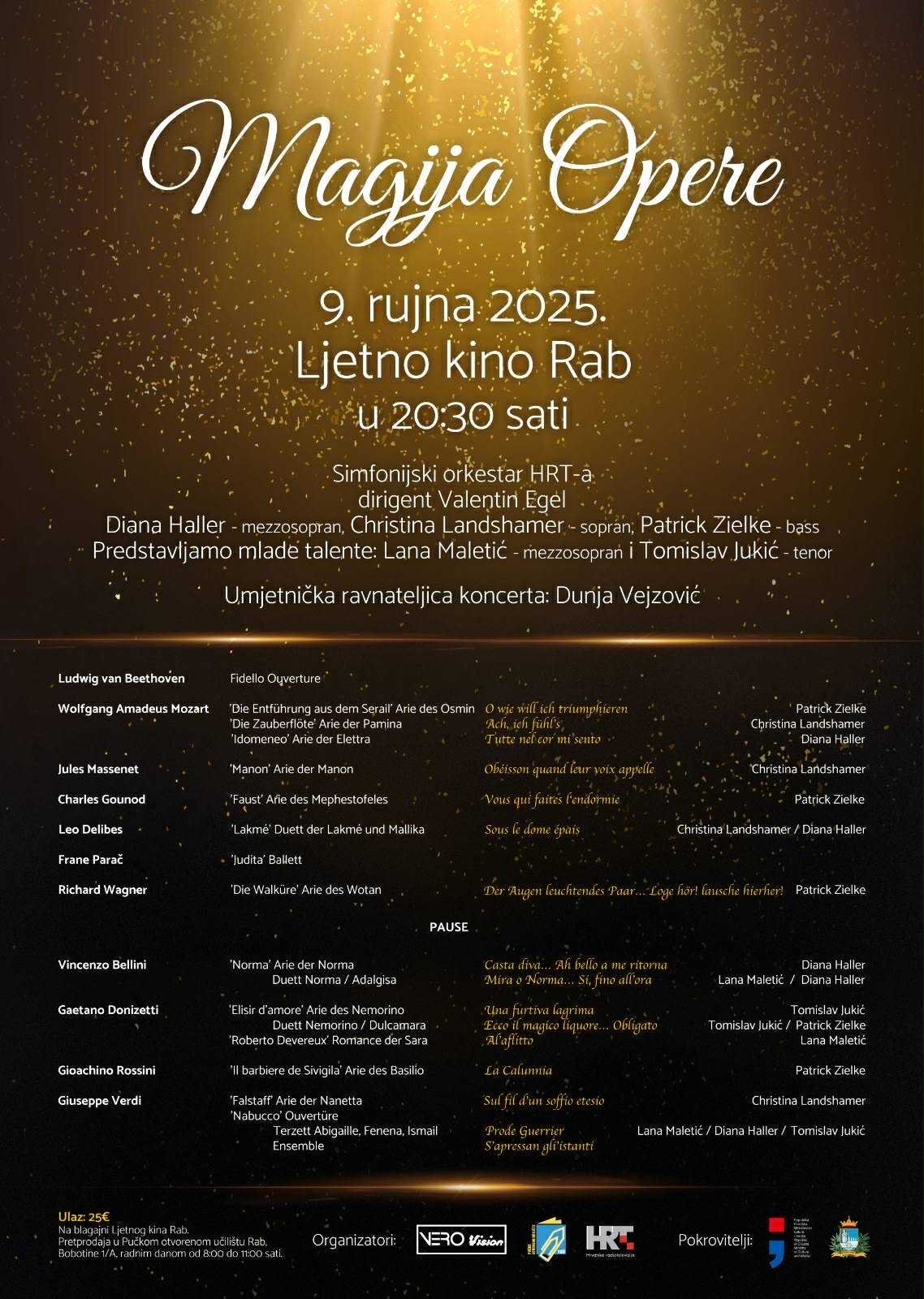 U organizaciji Vero Visiona i Pučkog otvorenog učilišta Rab, a pod pokroviteljstvom Ministarstva kulture i medija RH te Grada Raba “Magija Opere” donijet će izbor najpoznatijih i najljepših arija, dueta i orkestralnih ulomaka koji su stoljećima obilježili svjetsku opernu scenu. Riječ je o programu koji spaja vrhunsku umjetničku izvedbu i posebnu atmosferu ljetne pozornice.